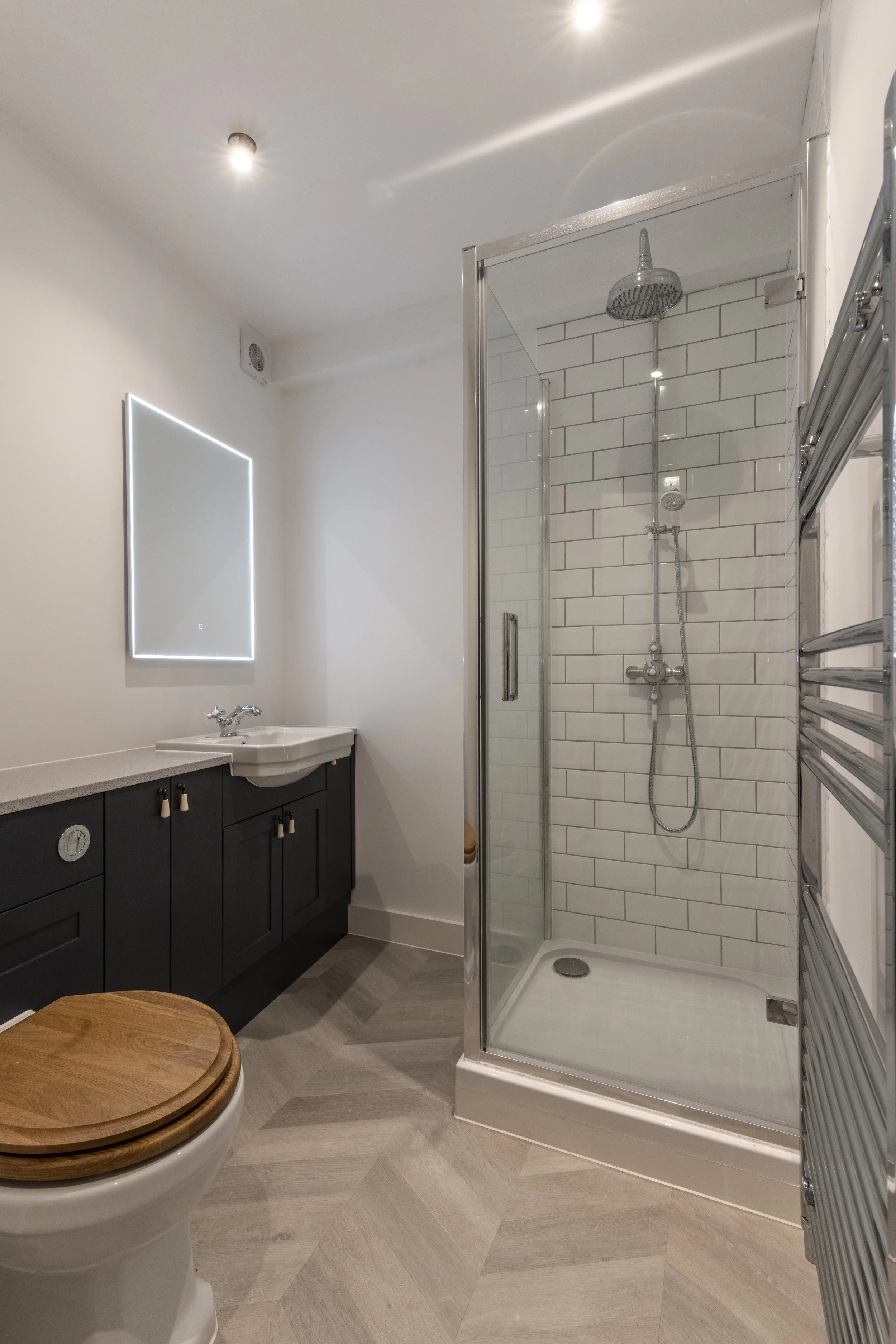 With our range of experienced tradesmen, this project was finished to a high level, with limewashed oak flooring in the kitchen and hall, internal Crittall doors from Salisbury glass. 2nd fix joinery included a bespoke tv unit in the living room and fitted wardrobes and vanity units in the bedrooms. Fully decorated throughout, this apartment is now a modern and stylish home fit for use.