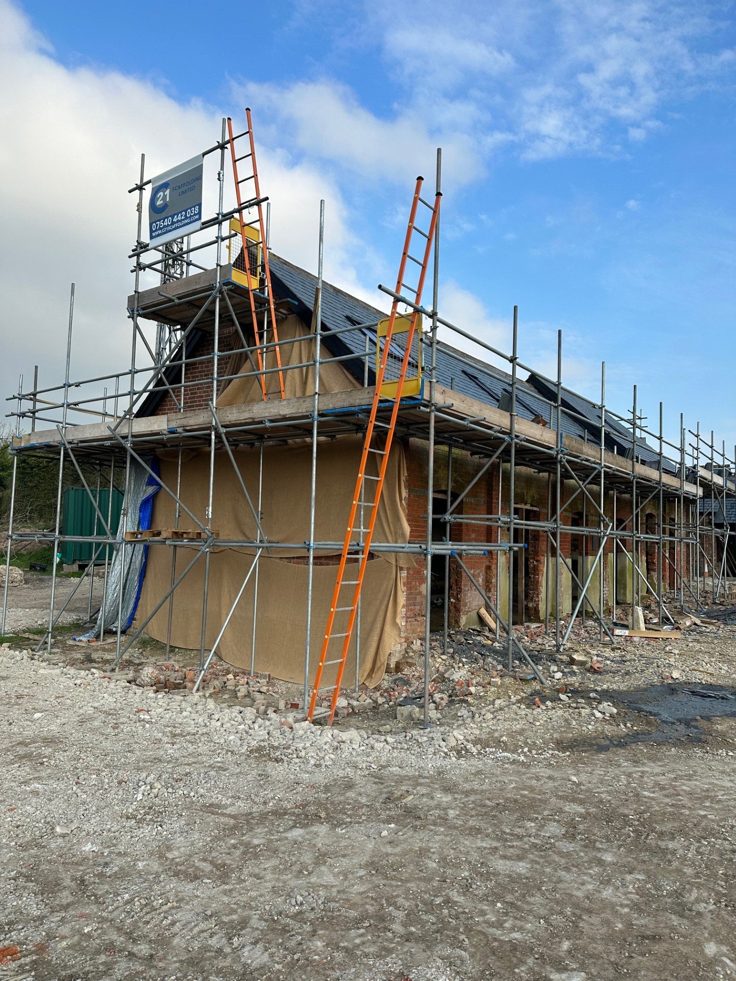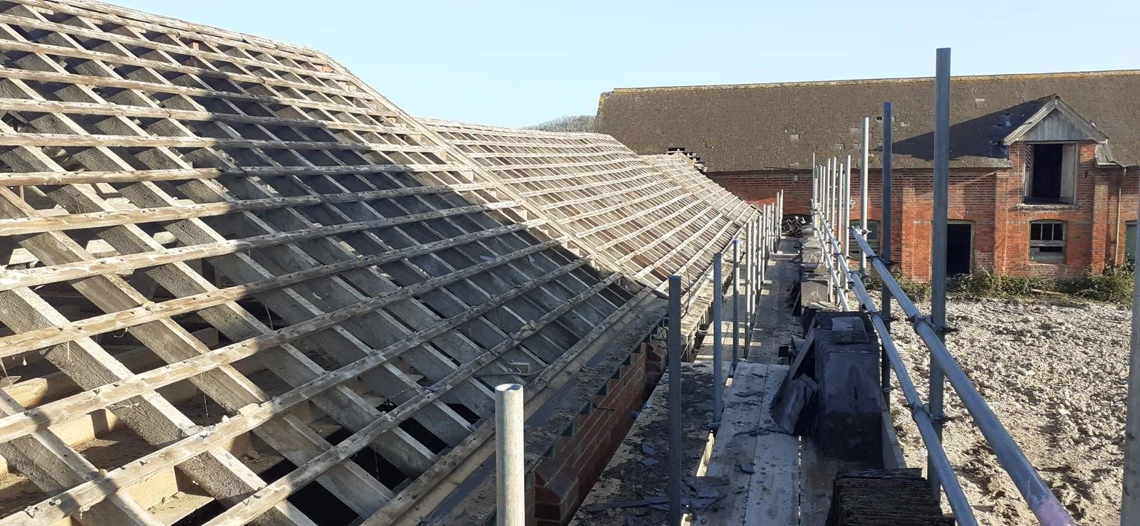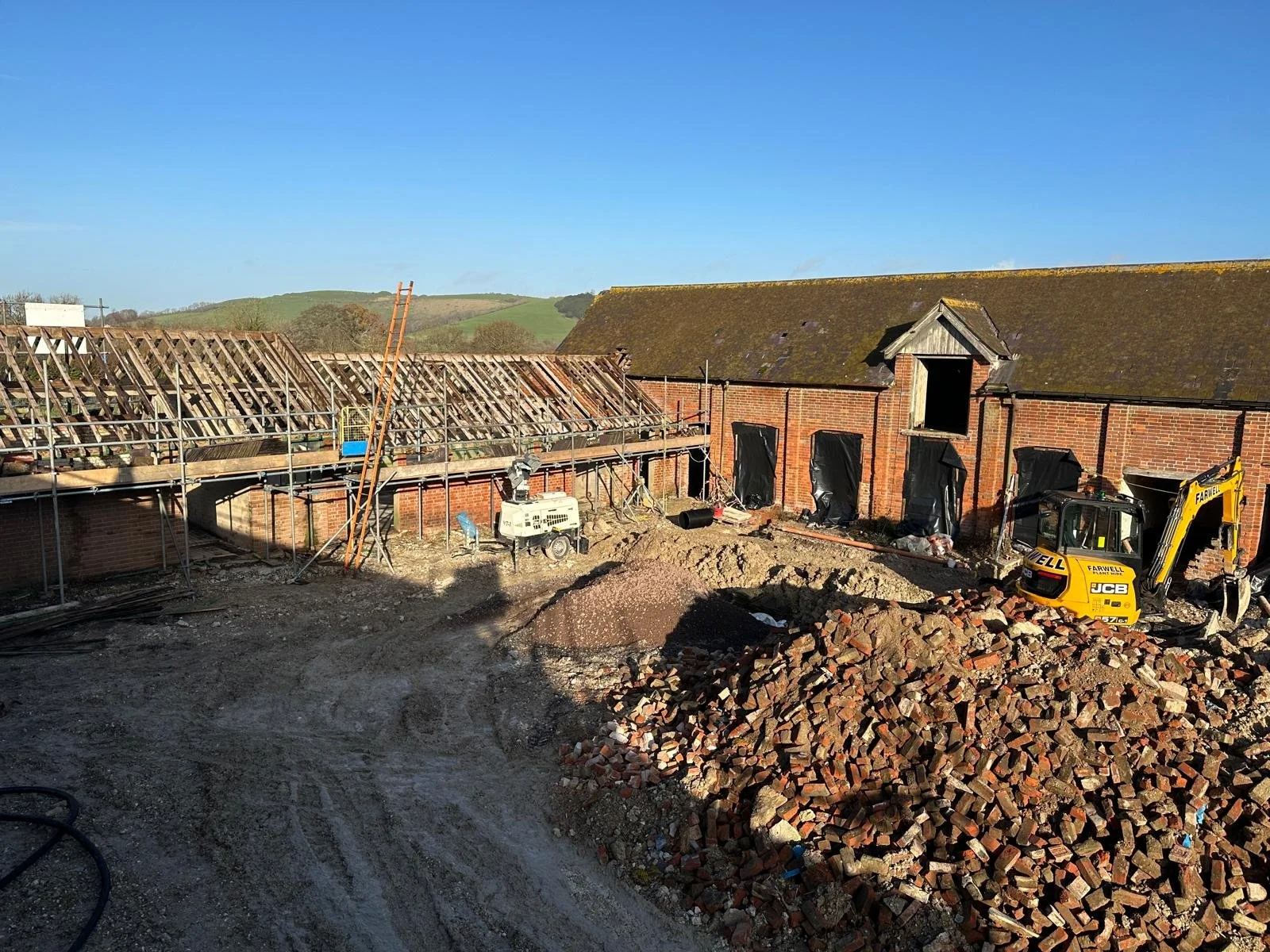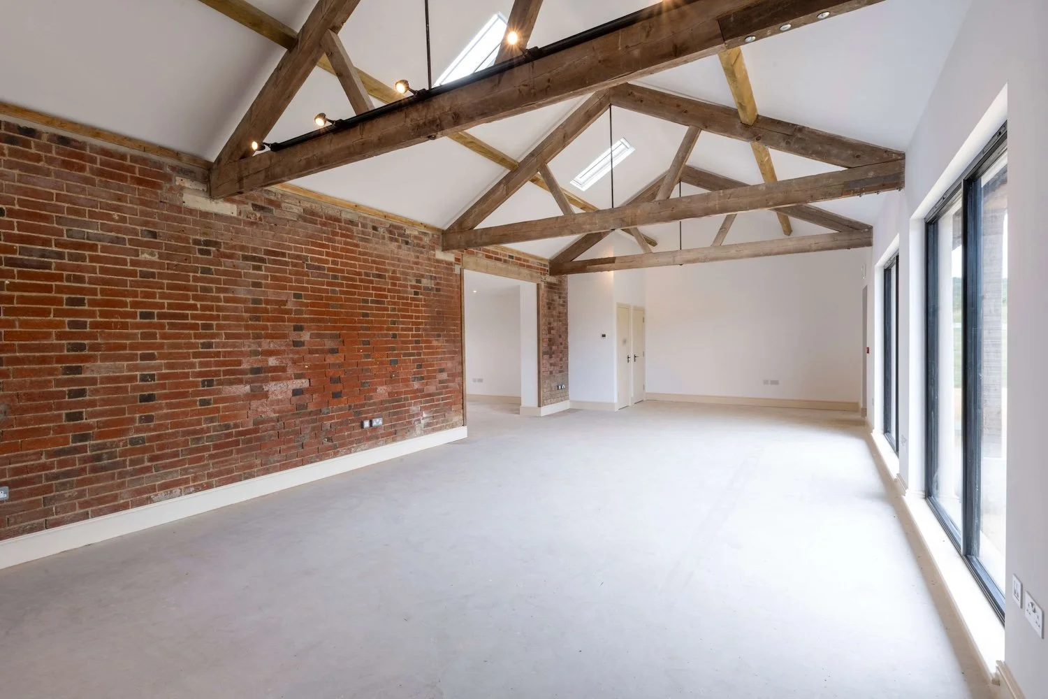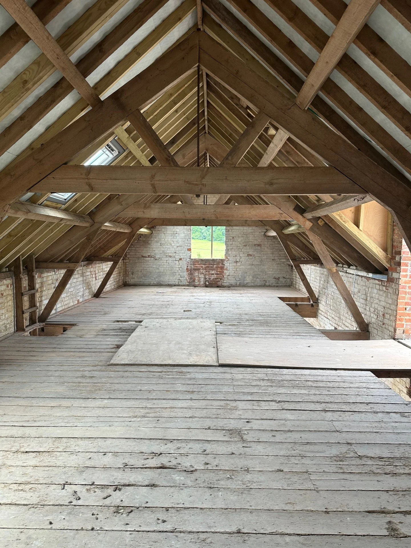 Phase 1 of this scheme involved the demolition of two large barns and several smaller outbuildings to make room for the formation of courtyard garden areas. The remaining barns were given new roof structures with beautiful timber trusses by our skilled team, who also installed Velux Conservation roof windows to preserve the character of this old farmyard. The roof slates were reclaimed from the old buildings, and all brickwork was repointed to continue our efforts in protecting the history and feel of the site.
