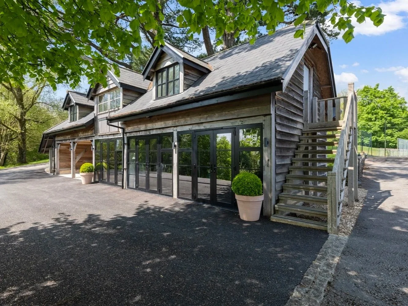 This commission involved a change of use converting an unused garage space with a studio flat above, into a luxurious gymnasium and office space with a WC. Half of the garage was transformed into a gym and office and the other half a covered carport. We clad the existing garage in reclaimed Larch Shiplap cladding.